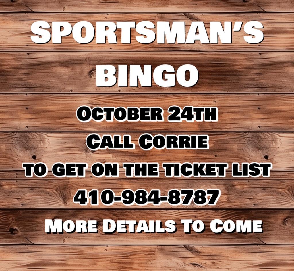 SAVE THE DATE!!Next Sportsman's Bingo will be October 24th in our newly renovated Activities Building! CALL CORRIE TO GET ON THE TICKET LIST! 410-984-8787